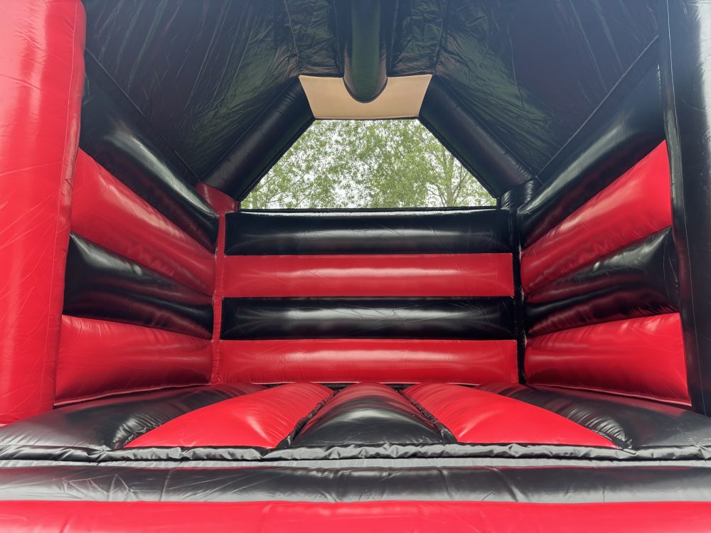 Die erkennbaren Symbole der Branche des Unternehmens sind auch oben auf der Hüpfburg deutlich sichtbar.