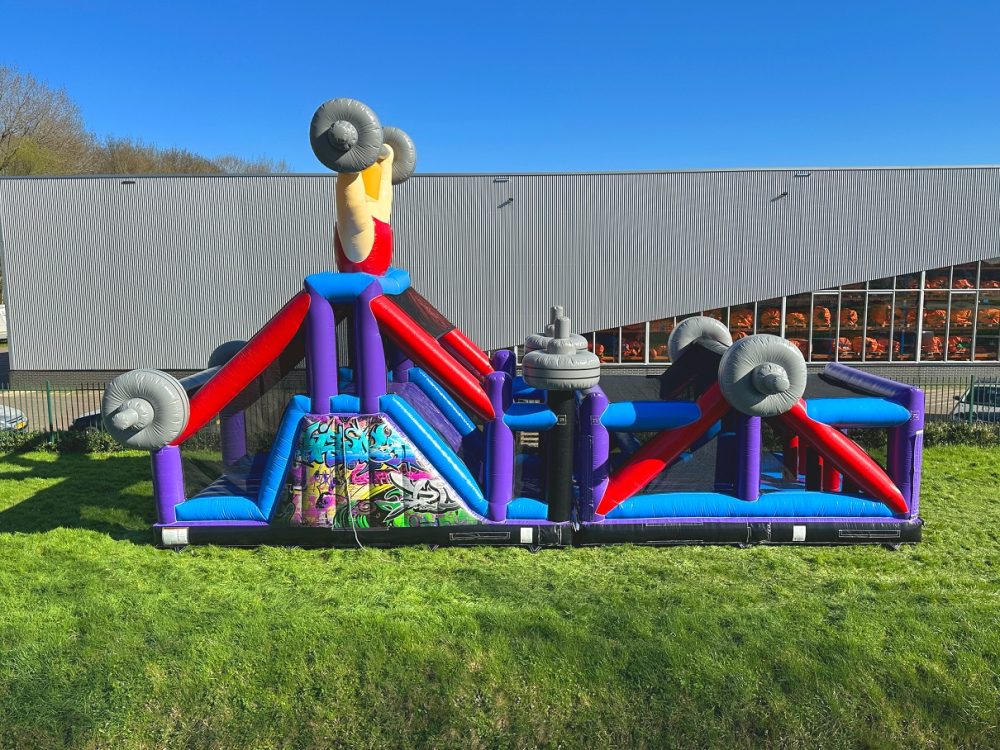 Dieser modulare Hindernisparcours Gewichtheber 13,5 Meter ist eine Herausforderung für Jung und Alt. Klettere die Kletterblöcke hinauf und rutsche wieder hinunter. Dann gibt es zwei aufblasbare horizontale Röhren, durch die Sie gehen müssen. Schieben Sie die Kugeln zur Seite und durch die aufgeblasenen Pfosten. Dieser Survival-Parcours hat einen schönen Aufdruck an der Seite und einen Maiskolben oben, was ihm ein frisches Aussehen verleiht.