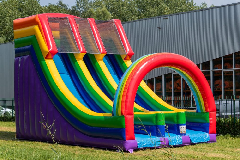 Diese fröhliche aufblasbare Doppelrutsche Modell ‚Regenbogen‘ bietet endlosen Spaß hoch 2, denn hier rutscht man zu zweit! Die stabile Treppe, die in der Mitte liegt bietet Zugang zu den beiden Rutschen. Dank ihrer 7 Meter Höhe und dem auffälligen Thema ist diese Rutsche das Highlight jeder Veranstaltung. Das farbenfrohe, lustige Thema macht es zu einem wahren Kinder-Magneten. Durch sein quietschbuntes Design ist dieses Modell ideal für Partys, Events und besondere Anlässe. Diese Rutsche garantiert stundenlangen Spielspaß und ist ein unvergessliches Erlebnis für groß und klein!